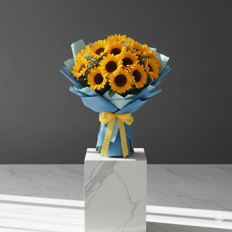 این دسته گل آفتابگردان طبیعی با رنگ زرد درخشان و طراحی شیک، انتخابی فوقالعاده برای انتقال حس انرژی، شادی و مثبتاندیشی است. ترکیب گلهای آفتابگردان تازه با بستهبندی مدرن آبی و پاپیون زرد، ظاهری خاص و چشمنواز ایجاد کرده که آن را به گزینهای محبوب برای هدیه دادن تبدیل میکند.